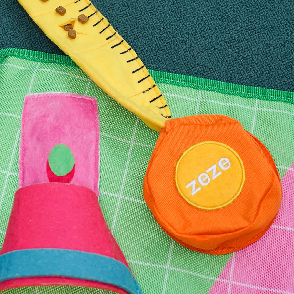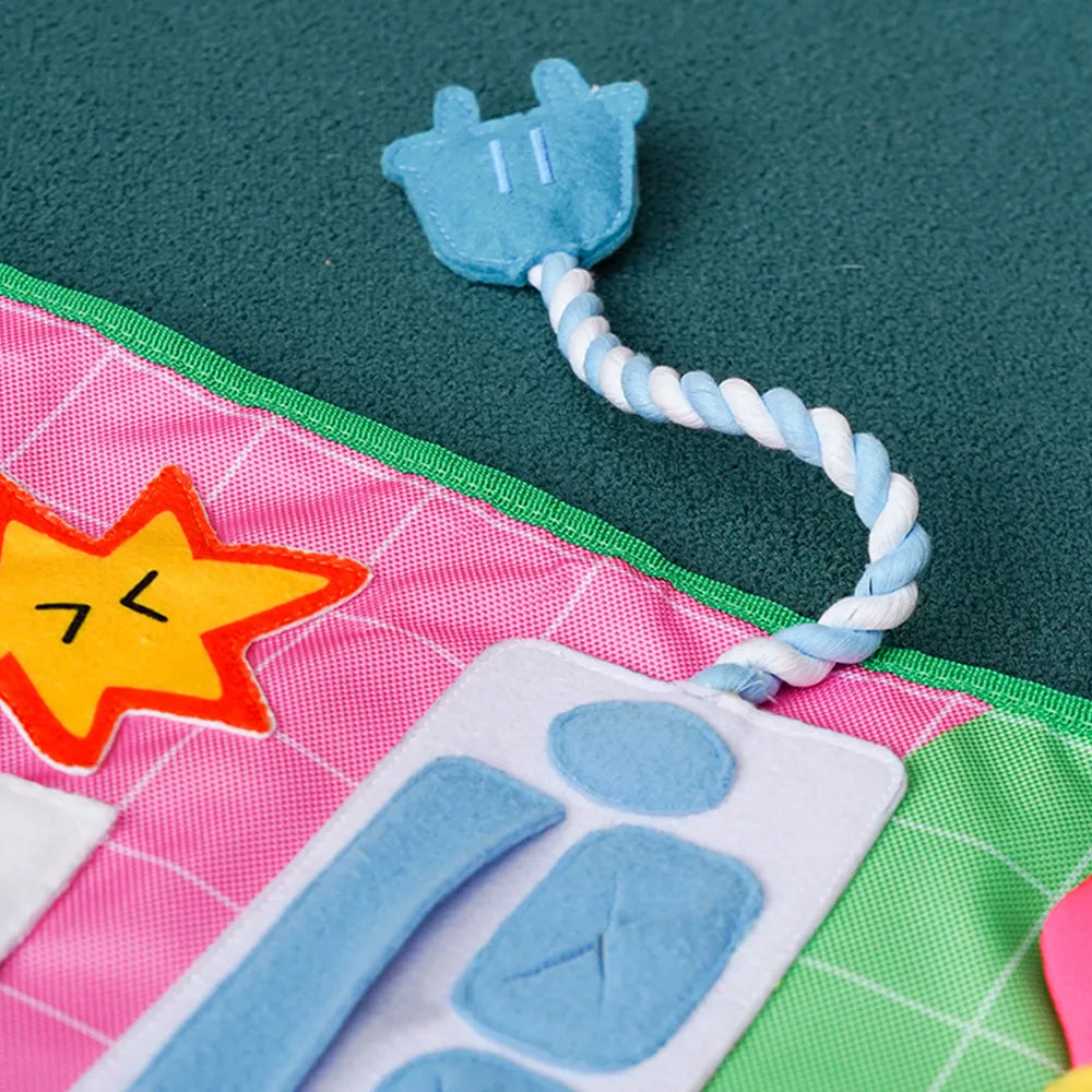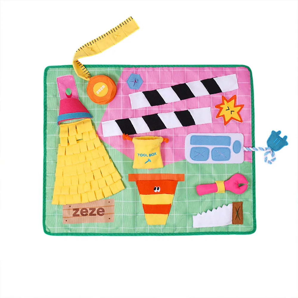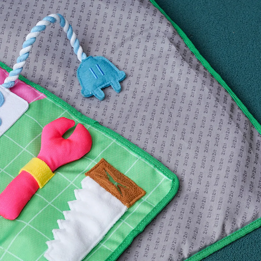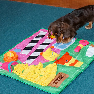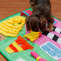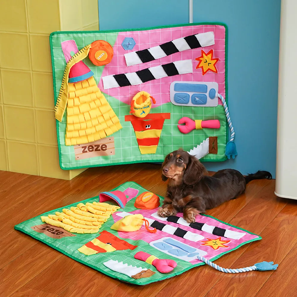 Durable, repairable snuffle mat enhancing canine mental stimulation and feeding control.