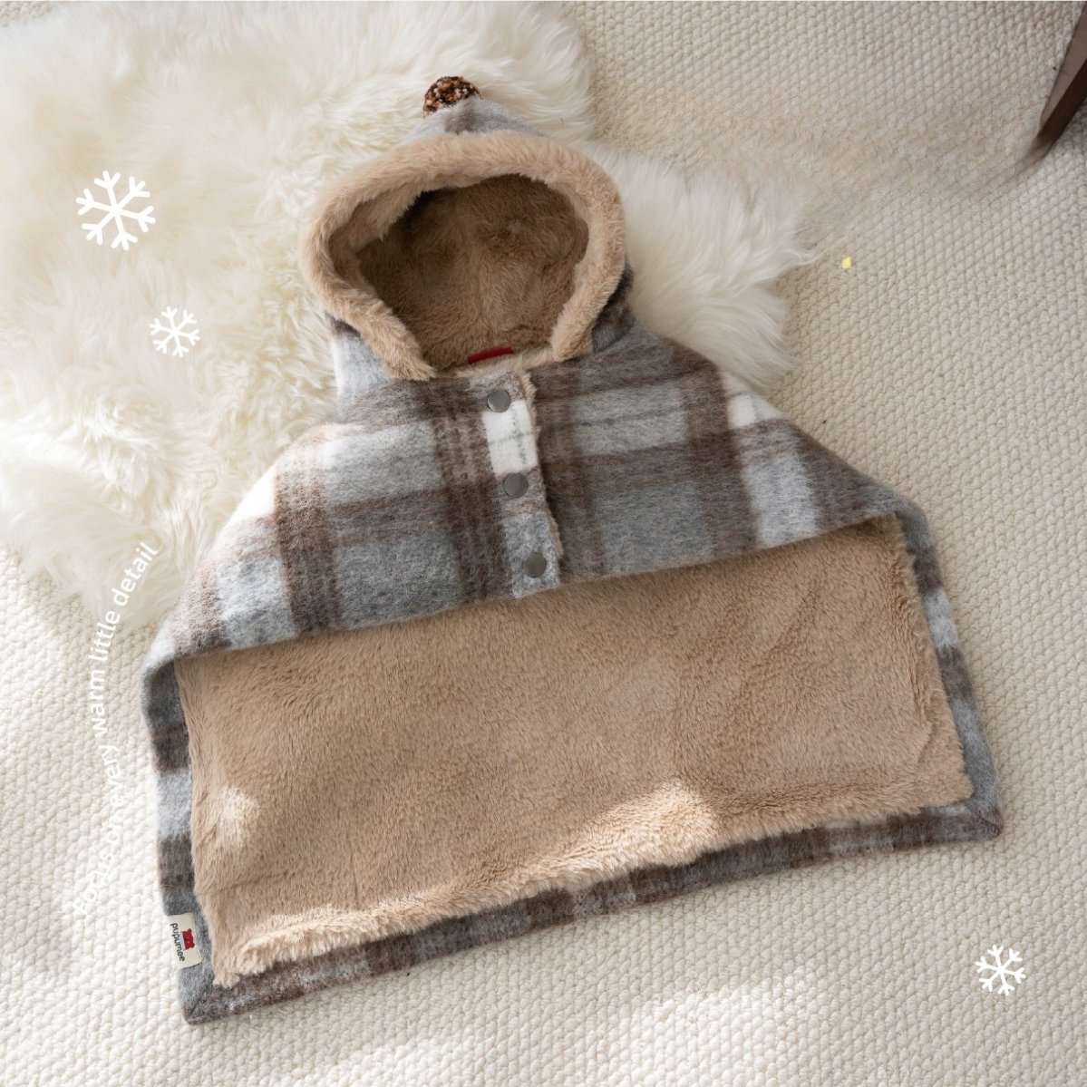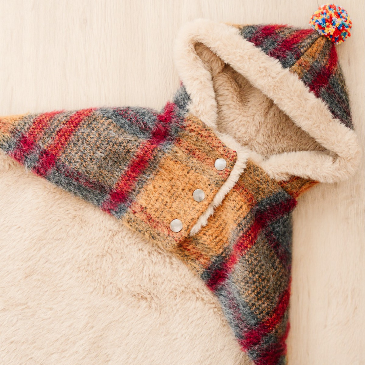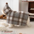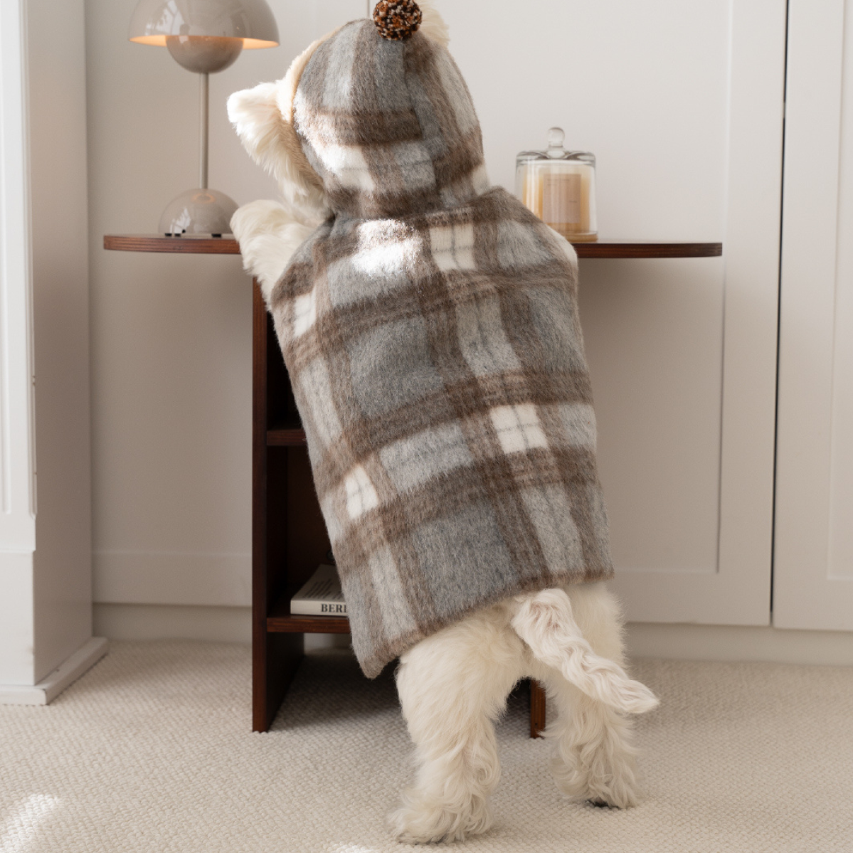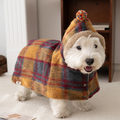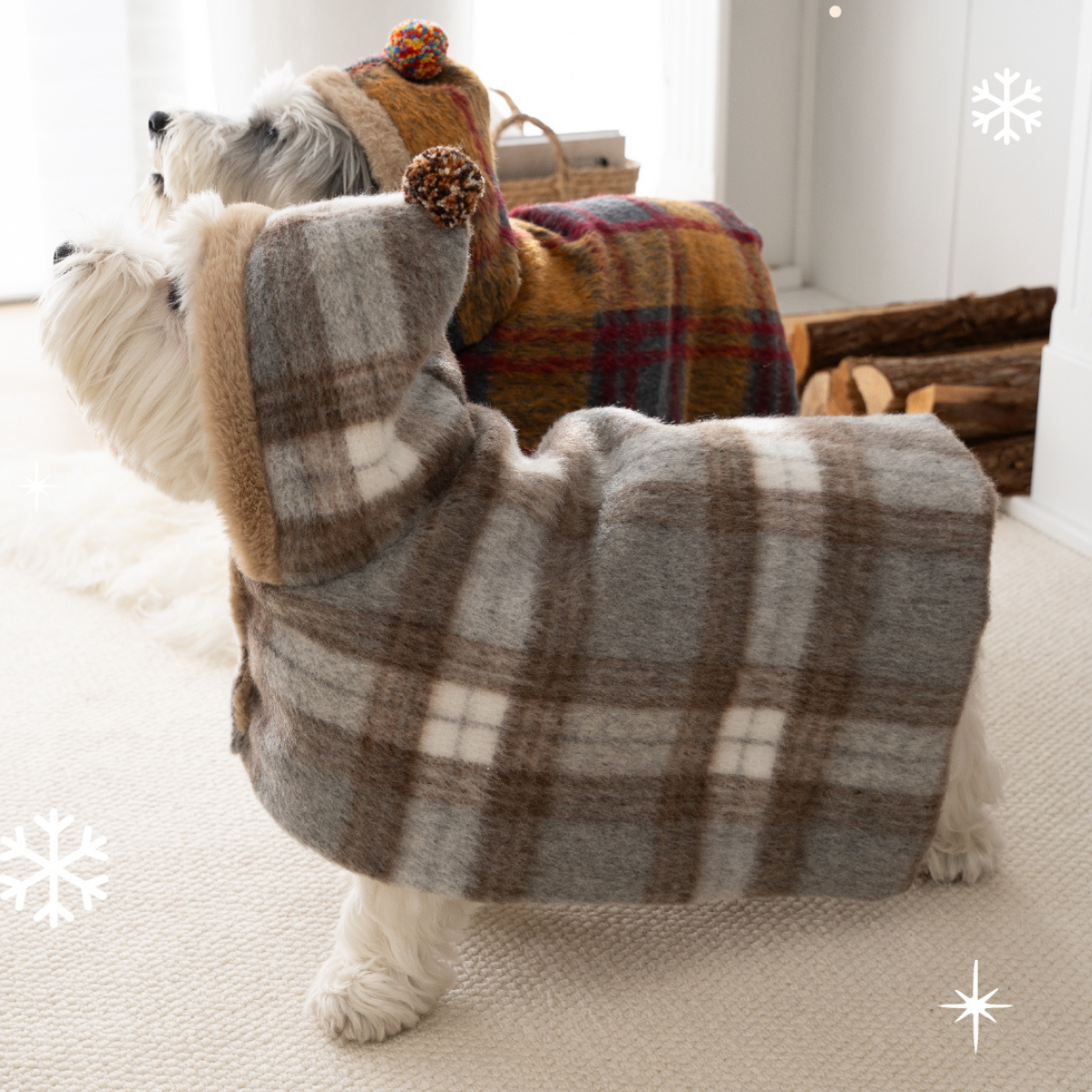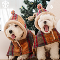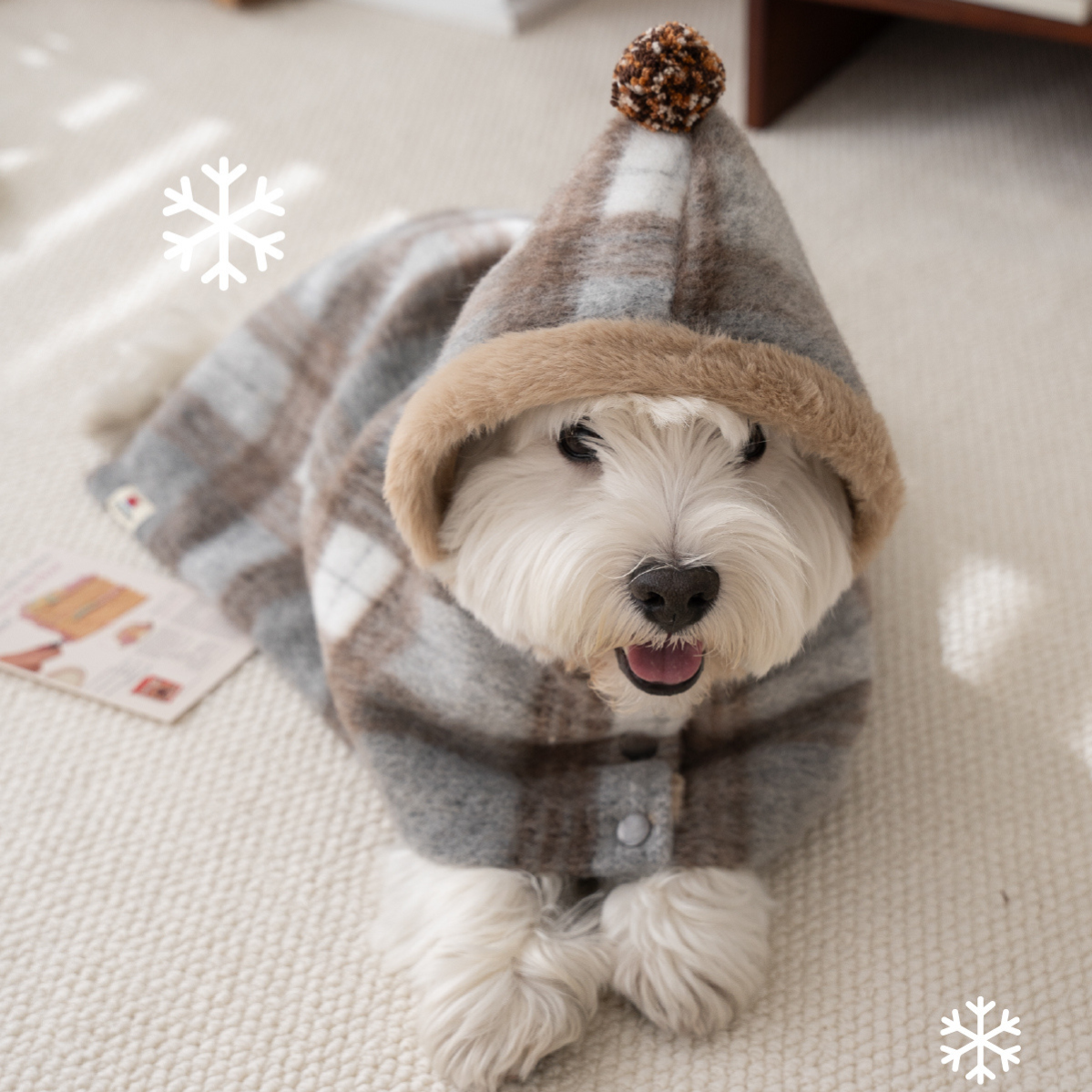 A cozy and festive hooded cape that keeps your pet warm and adorable all winter.